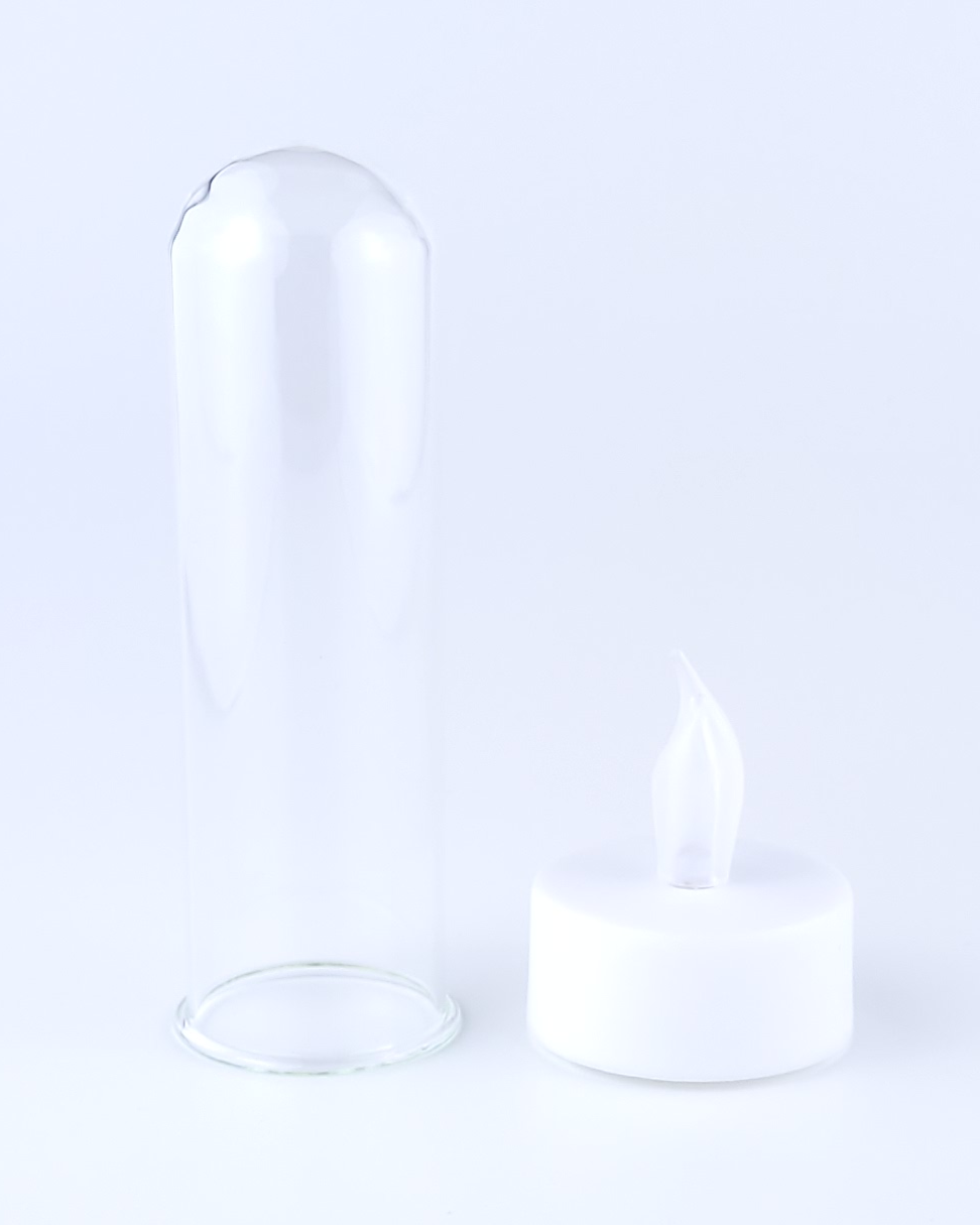 Unsere Vasen kommen alle mit einem für Frischblumen geeigneten Reagenzglas und einem sanft flackernden LED-Teelicht mit 6h Timerfunktion.